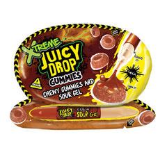 Zachte fruitige Juicy Drops en een knijpbare pipet gevuld met zure gel! Knijp de gel over de gummies en geniet van extra lekkere zure snoepjes.